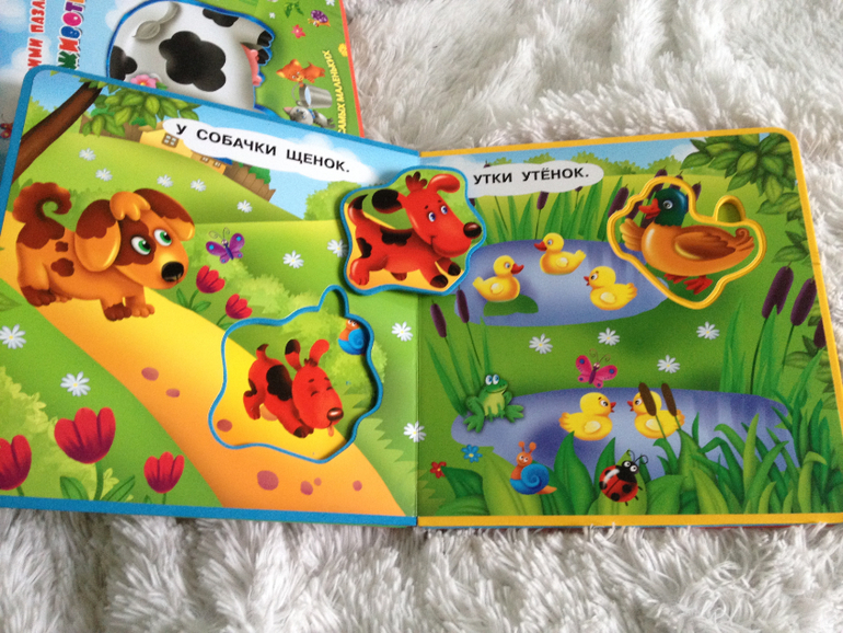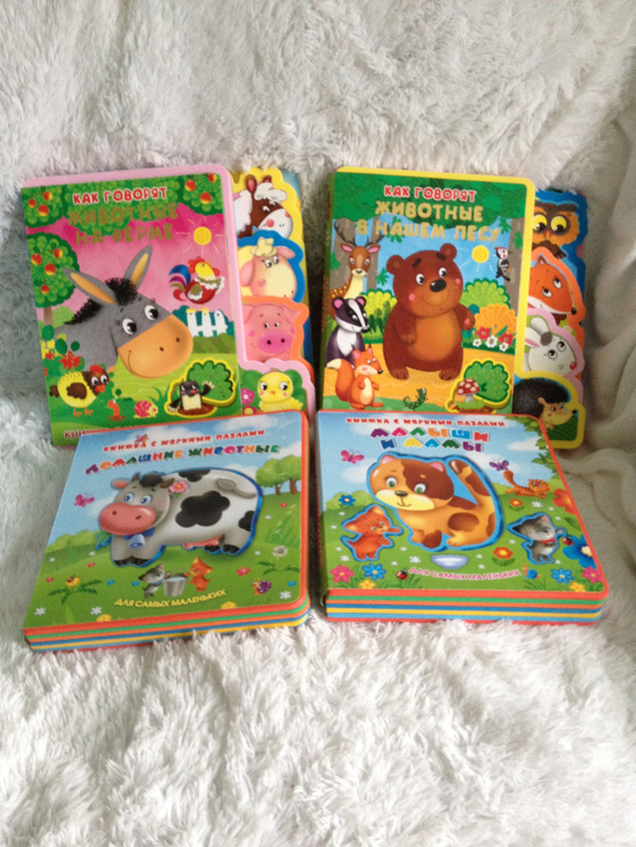 Двух издательств Омега и АСТ. От Омега мне нравятся гораздо больше, там более толстые ЭВА-странички и сами пазлы. Но сами вынимающиеся пазлы НЕ животные и ими отдельно нельзя играть. От АСТ сами странички и пазлы намного тоньше(видно на фото),но есть большой плюс-все что вынимается- это животные и ими можно играть отдельно. Но из-за того что они тоненькие, сын уже свернул лошадке голову)))) В целом, они мне все очень нравятся, да и сыну тоже. Можно учить животных, да и вообще забавный глазик в дырочке заставляет малыша любопытствовать кто там и вынимать пазлы. Самая любимая часть-трактор)))сын выниимает его и таскает по квартире. Единственное, вставлять пазлы на место ему совсем почему-то не интересно!