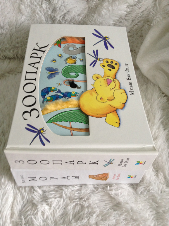 Первыми книжками, на которые наш сын стал реагировать, стали книжки Мэтью Ван Флита изд Махаон. Сыну было около 7 мес.Сначала я купила В зоопарке, наверное,последнюю в нашем городе по заоблачной цене в Амитале. Но она того стоила. Она могла отвлечь его от капризов, плача. Как только я ее доставала сын замолкал и как загипнотизировал водил пальчиками по шерстке (тактильным элементами), смотрел как двигаются подвижные части в книжке. Под впечатлением от такой удачи(ура!!!сын заинтересовался) я заказала уже в Лабиринте Морды(тогда они еще были в наличие).Как оказалось, она ему понравилась даже больше. Судите сами, сегодня разложила все книжки, чтоб сфотографировать для ДК и из всех он выбрал именно Морды. И так было трижды, я ставила для фото ,он подходил и именно ее брал и начинал листать. Единственное, стихи там ,конечно, переводные и у меня даже до сих пор затруднения читать это сверху вниз или слева направо. Особой рифмы я не наблюдаю) .Еще в конце,в Зоопарке много разных животных,мы их очень любим разглядывать.