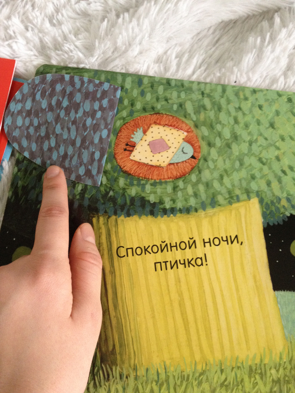После нее сын начал говорит "Где?" )))Пульт от телевизора(специально спрятанный, чтоб мультики не включал) ходит и вопрошает "где", то же при поиске сока,пюрешек,папы и тд. Это наша вечерняя книжка ,перед сном читаем, видим, что песик спит и птичка спит и Миша спать идет сам)) (ну это в идеальном случае ,конечно) Но клапаны в ней мягко говоря тоненькие.У нас они уже сильно "залюблены".Но книжка отличная! Наша бабушка до сих пор не понимает, что это за создание ищет птичку)))