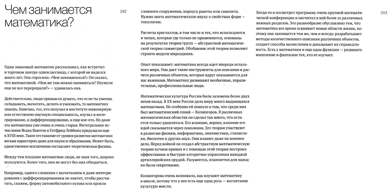 "Например, одного сложения с вычитанием и даже интегрирования с дифференцированием не хватит, чтобы рассчитать, скажем, форму автомобильного кузова или кровли сложно сооружения, корпуса ракеты или самолёта. Нужно знать математическую науку о свойствах форм - топологию. [...] Когда-то я посмотрел программу очень крупной математической конференции и начитал в ней более 20 различных важных разделов. Это разнообразие обусловлено тем, что математика всё время осваивает новые области жизни, поэтому она занимается тем же. чем и всегда: разрабатывает методы количественного описания различных объектов, создаёт способы вычисления и доказывает их справедливость".