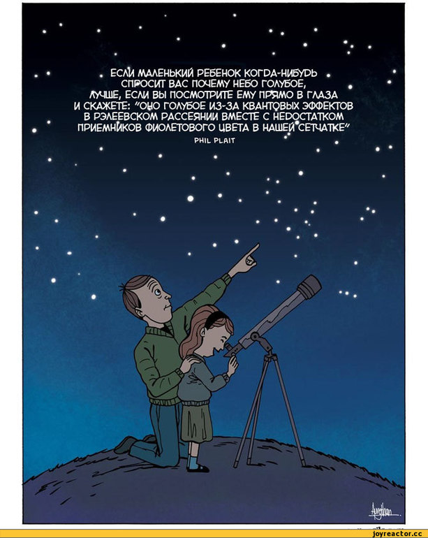 «Если маленький ребенок когда-нибудь спросит вас почему небо голубое, лучше, если вы посмотрите ему прямо в глаза и скажете: "Оно голубое из-за квантовых эффектов в рэлеевском рассеянии вместе с недостатком приемников фиолетового цвета в нашей сетчатке"» © Фил Плейт