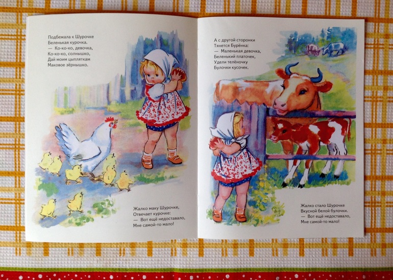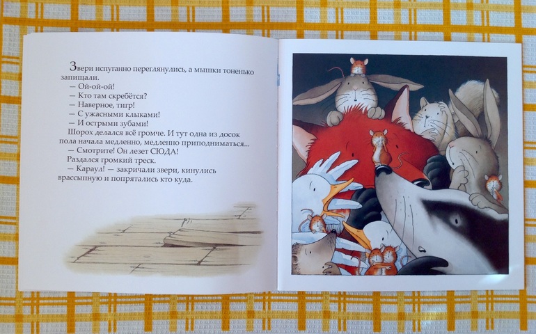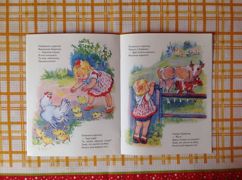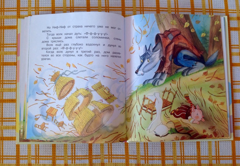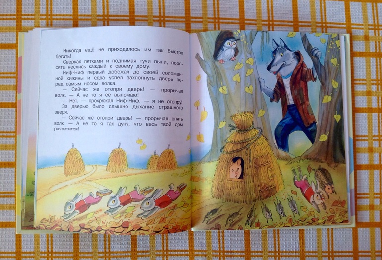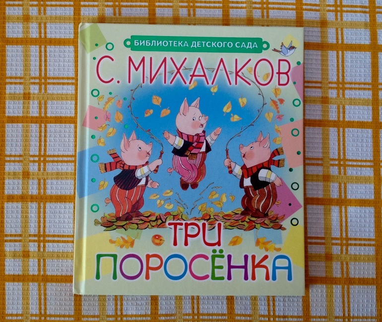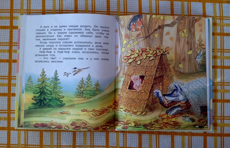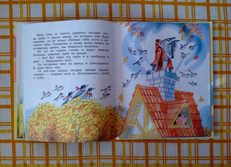 Я долго выбирала поросят в нашу библиотеку- и выбором осталась очень довольна! Добрые картинки, достаточно приличное оформление. Текст полный, я пока устно его адаптирую, сыну понятно и интересно. Любимый момент когда волк лезет в трубу, проводим аналогию с мишкой из теремка.