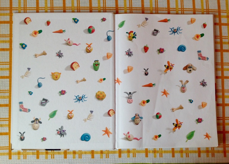 Пластилином мы еще особо не лепим, а просто рассматриваем картинки, особенно форзац и нахзац. Еще я придумываю сюжеты на каждый разворот. Готовимся морально к лепке зверей. Пока максимум- это колбаски и из формочек выдавить пластилин.