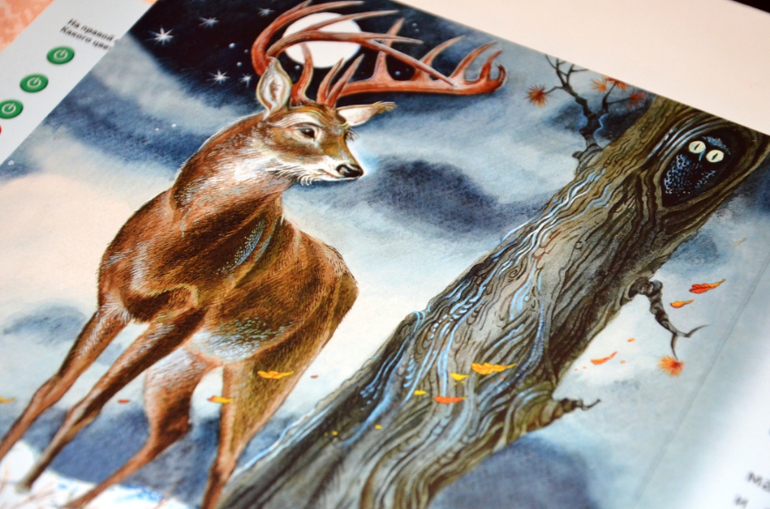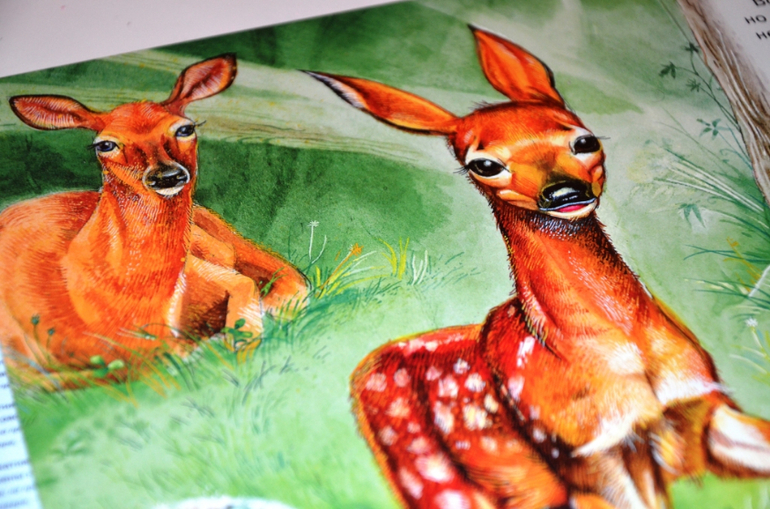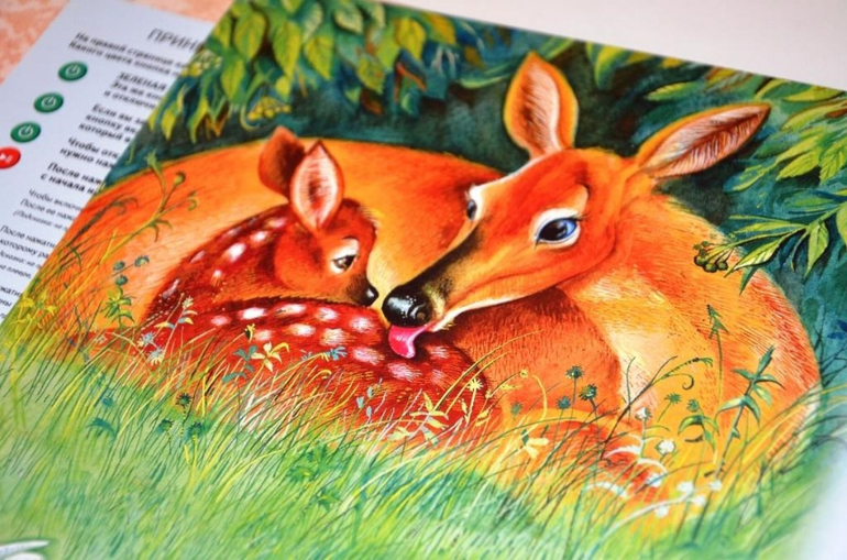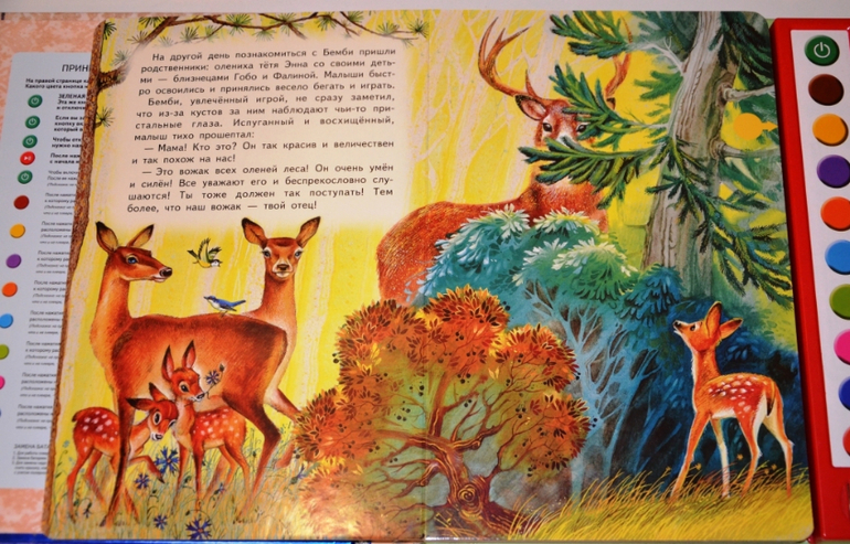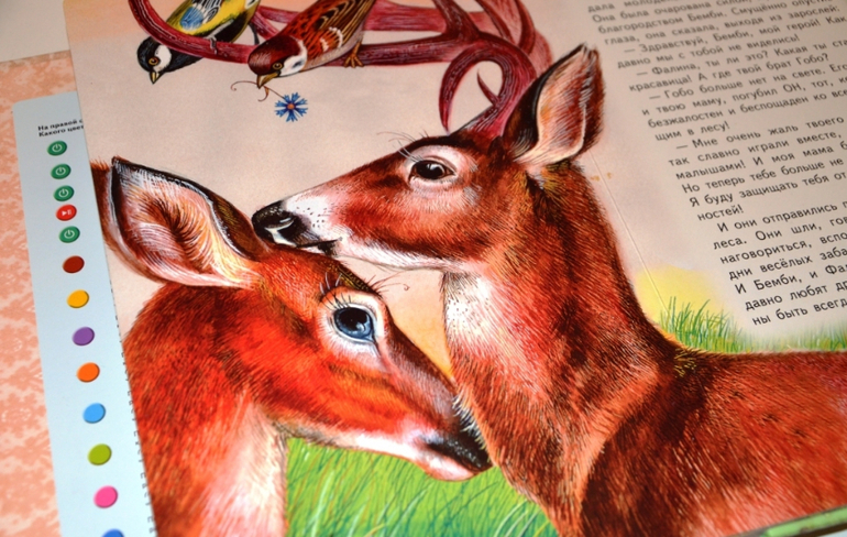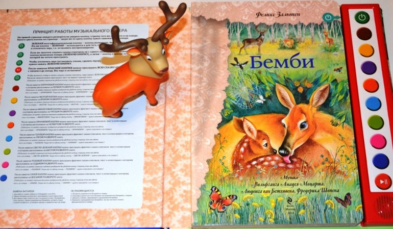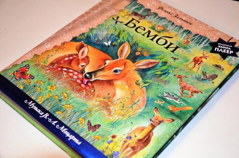 "Волшебная книга-плеер", наша, естественно о нём, любимом, милом, с носиком угольком и глазками-бусинками, Бемби. Вообще первое знакомство с этим произведением Феликса Зальтена у Ариши состоялось с мультфильма, того старинного, доброго от Диснея 1942 года (а-та-та). После которого она стала просить почитать о Бемби.