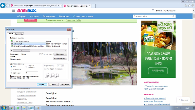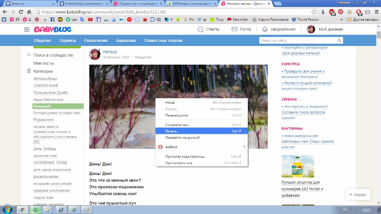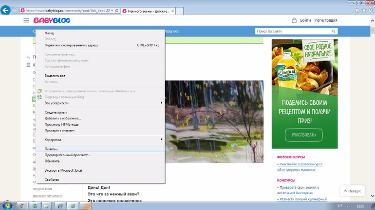 В первую очередь смотрим, установлена ли на компьютере программа, которая позволяет создавать PDF и устанавливает виртуальный принтер. Это может быть что-то вроде Adobe Acrobat, PDF Creator и подобные им. Можно это сделать через алгоритм "Пуск" - "Все программы". Но проще проверить это следующим образом. Заходим в свой интернет-браузер, у меня это Google Chrome. Но я покажу и на Internet Explorer. Открываем нужную страницу. Нажимаем правую кнопки мыши и выбираем печать.