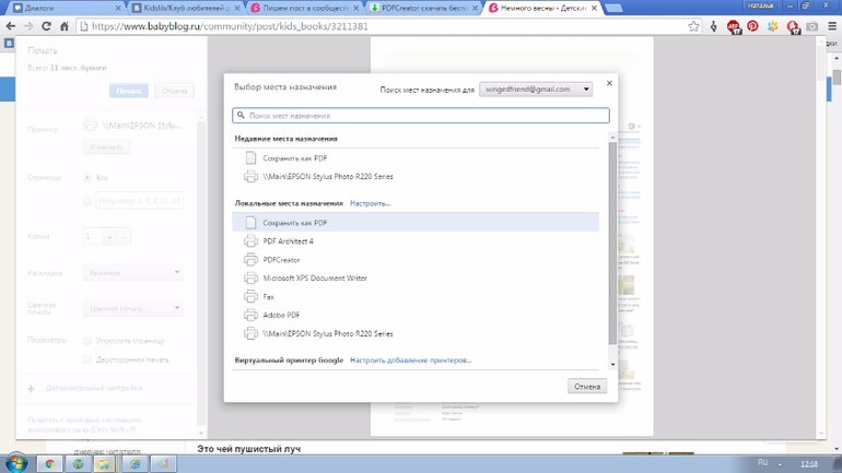 В Google Chrom мы получаем окно печати, где можно выбрать различные параметры. Например, сохранить не все страницы а только часть, а также выбрать куда именно сохранять документ.