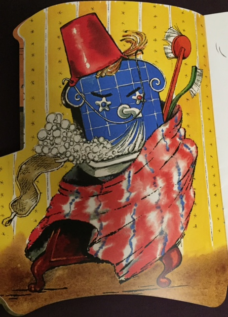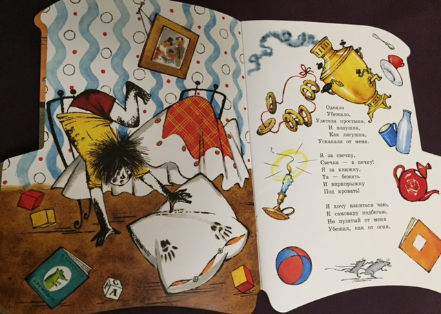 Рисунки красочные, крупные, четкие. Все утюги-сапоги-пироги и прочие сбежавшие от неряшливого хозяина вещи прорисованы и узнаваемы.