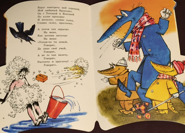 Синий крокодил просится в крокодилью компанию Матти :) Таким он был и в моей детской книжке. И точно такая бабочка-каталка, как у Тотоши, была и у меня ))) Цвета только в современной книжке чуть затемнены (я нашла в сети фото издания 40-летней давности.)