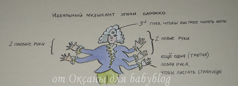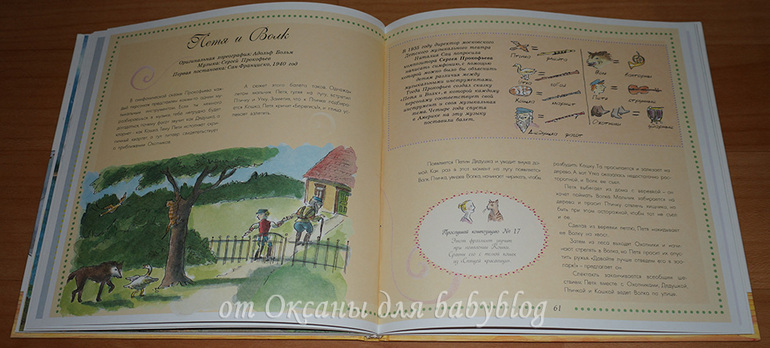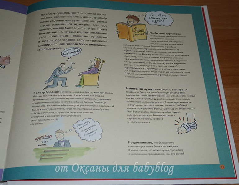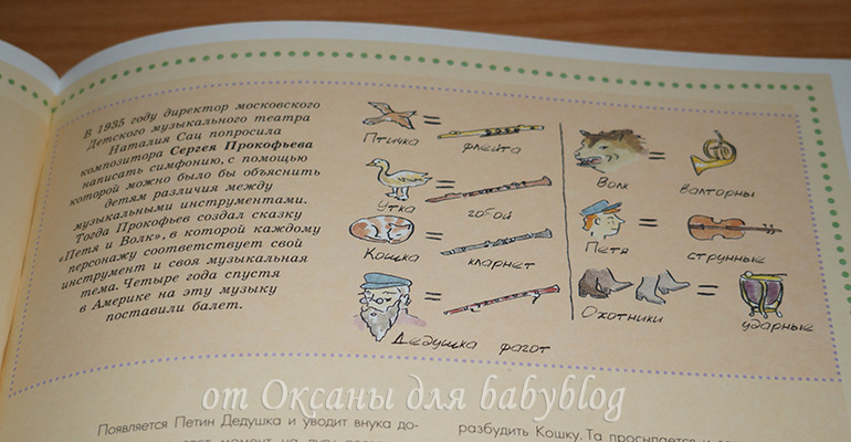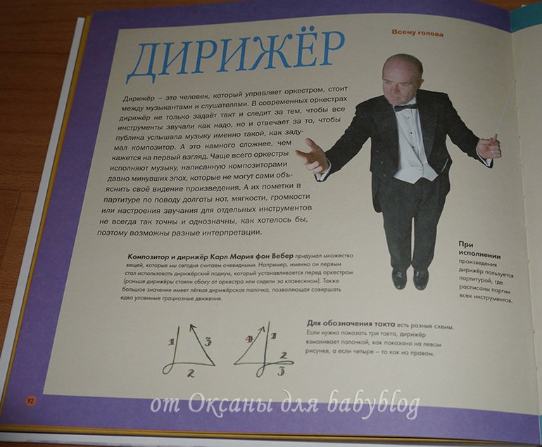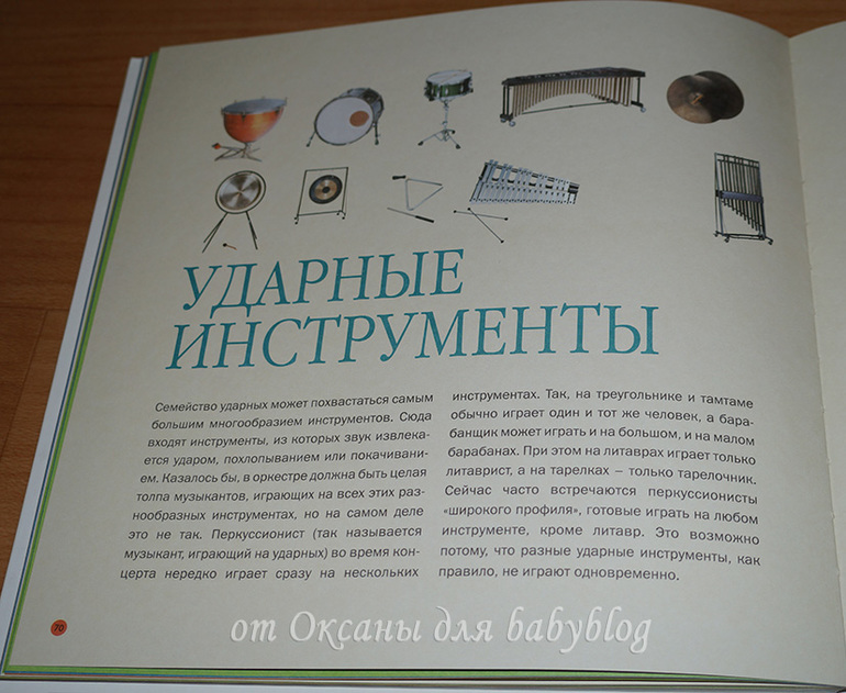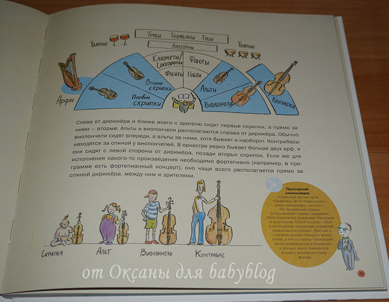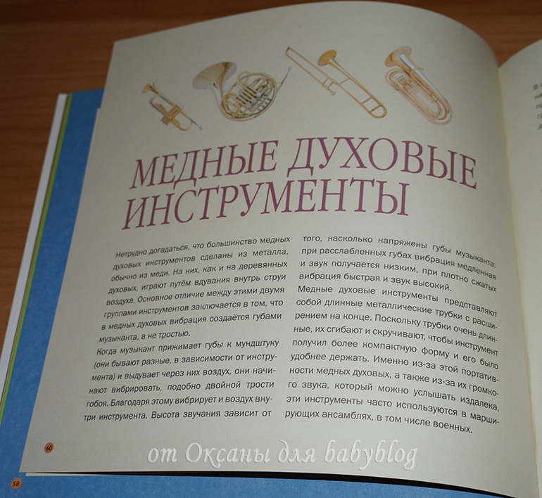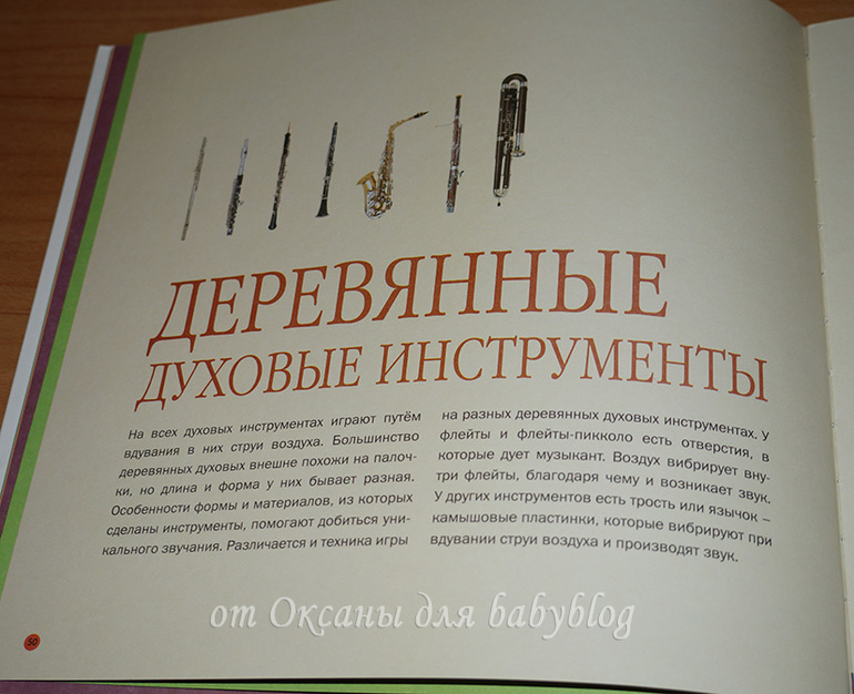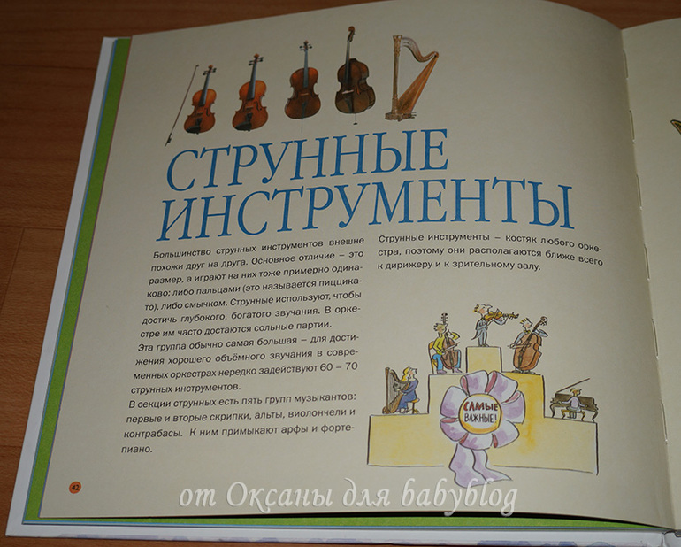 О каждом заявленном в виде мини-картинок инструменте есть рассказ. На целый разворот или на одну страничку. Вот, например, разворот о моей любимой скрипке (я на ней училась играть целых 7 лет).