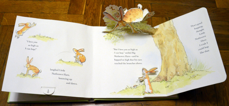 Она живая! Зайцы прыгают, разводят лапы широко-широко и высоко-высоко, целуют и шепчут на ухо, словом, все то, что делает эту книгу проникновенной и любимой всеми. Можно долго говорить, но все и так видно в ролике, который можно посмотреть тут.