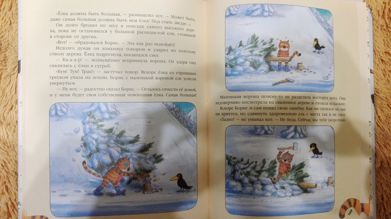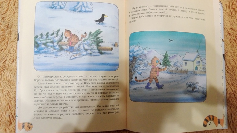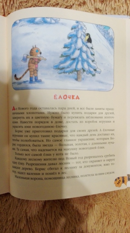 Единственная история, которая мне не понравилась про Елочку. Прочитали с дочкой, обсудили действия кота, что так поступать нельзя, что он загубил елочку и т д. Дочка даже пальчиком погрозила, ай ай ай, нельзя так делать.