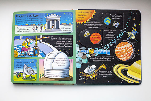 Именно такой стала книга «Секреты космоса» из серии «Волшебные створки». В ней можно найти краткую информацию обо всех планетах, о Солнце, о Земле и Луне, о путешествии на Луну, об истории астрономии. И все это легко и понятно. А множество створок, за которыми скрывается дополнительная информация по теме, добавляют интриги во время первого чтения.