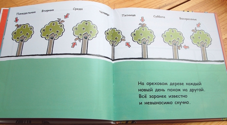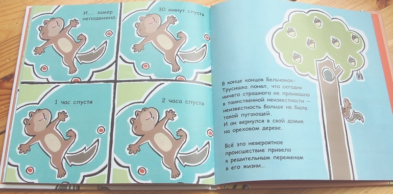 «Бельчонок-трусишка» Мелани Вотт издательства «Мир и образование» никогда не встречала в сообществе и взяла на пробу. Книга с простыми контурными рисунками о том, как бельчонок жил на дереве. Ему нравилось предсказуемость его жизни и он боялся перемен, но постепенно стало скучно. Неожиданно случилось…. происшествие… и он перестал бояться ) Такой вот простой незамысловатый сюжет, который переводчику можно было бы сделать не таким техническим, на мой взгляд. Несмотря на простоту рисунков и текста, я бы отнесла её годам к трем.