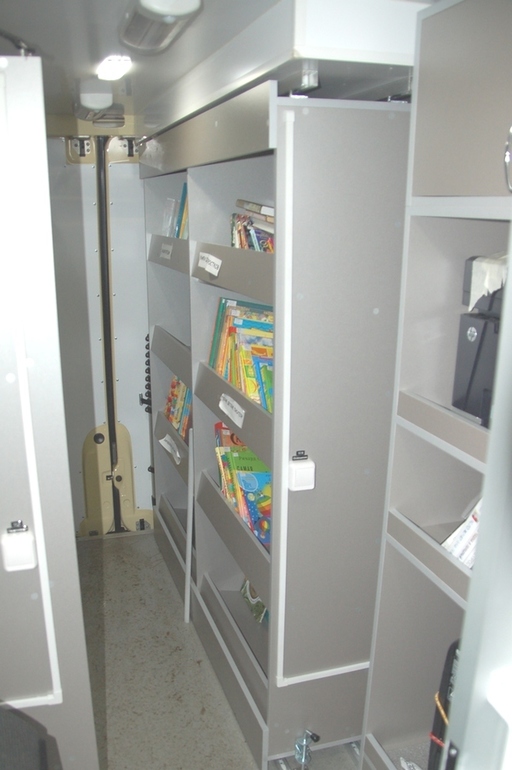 Покажу, что внутри. Половину салона занимает столик библиотекаря и всякое вышеперечисленное оборудование. Вторую половину - узенький проходик со шкафами по сторонам. Ходить там можно только в одиночку, да и то почти боком.