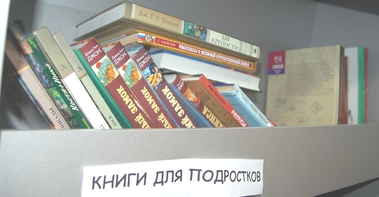 Среди полочки «Книги для подростков» наблюдаем «Дети блокады», «Рассказы о Великой Отечественной войне», книги Льва Кассиля. Здесь же Толкин и Диана Уинн Джонс.