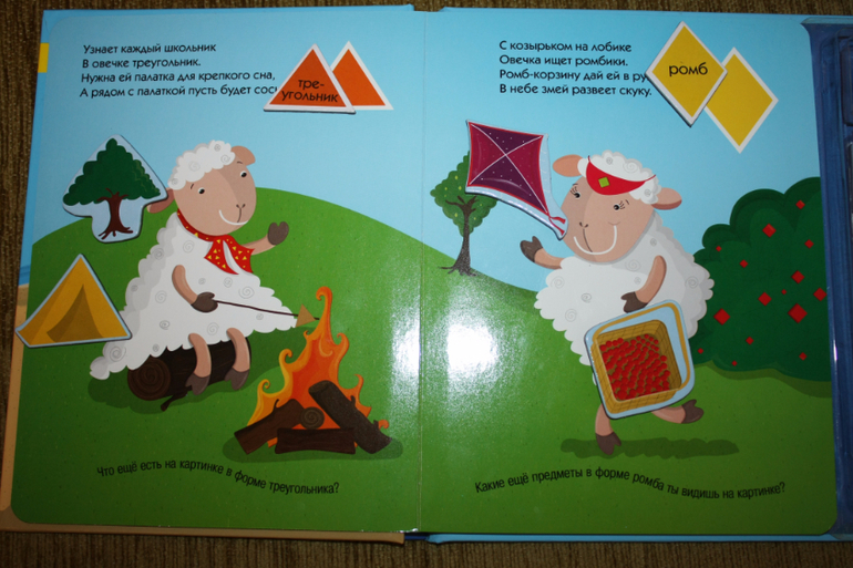 Формы сын знает уже давно, но очень ему нравится эта книга с магнитными страничками. Текст не фонтан, но видимо привлекает интерактивность - я читаю, он ищет палатку, сосну и т.д. и приклеивает.