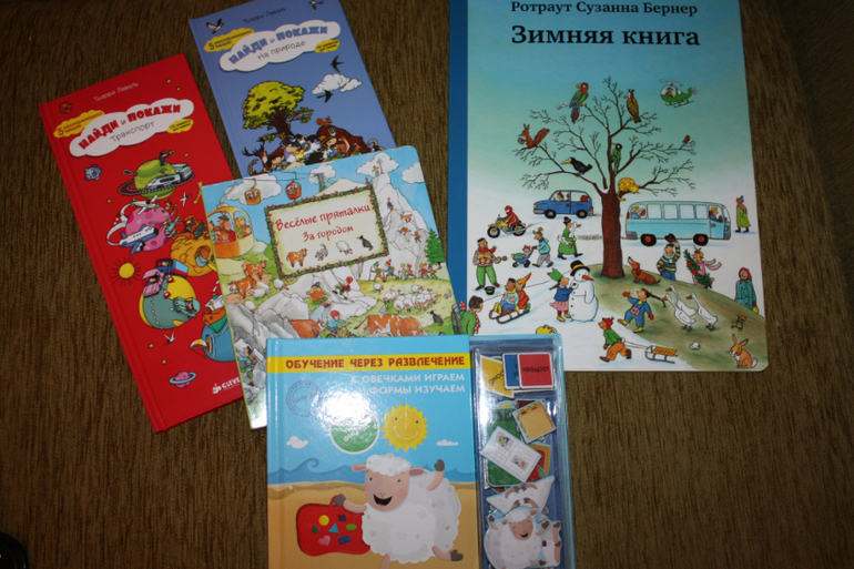 Веселые пряталки за городом у нас давно. Мне нравятся книги из серии "Найди и покажи" тем, что надо запомнить в памяти предмет, который будем искать, обычно он на полях книги, а тут смотрим, запоминаем, раскрываем и ищем уже по памяти. Но в не нравятся сдвоенные глаза у людей и животных...