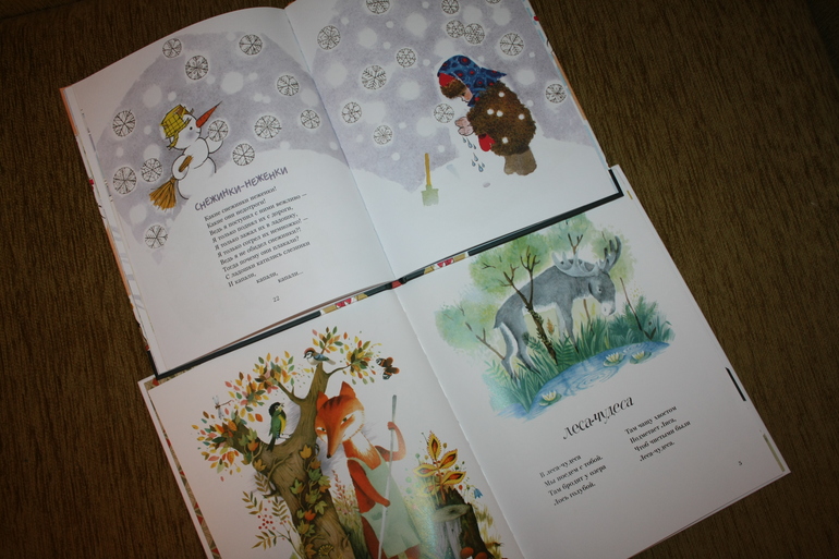 Читали "Леса-чудеса" и "И громко, и на ушко". Второй сборник обожаю и я, и сын. Многое выучили наузусть. Очень советую его всем малышам. Очень нежное и трогательное стихотворение про снежинки:
