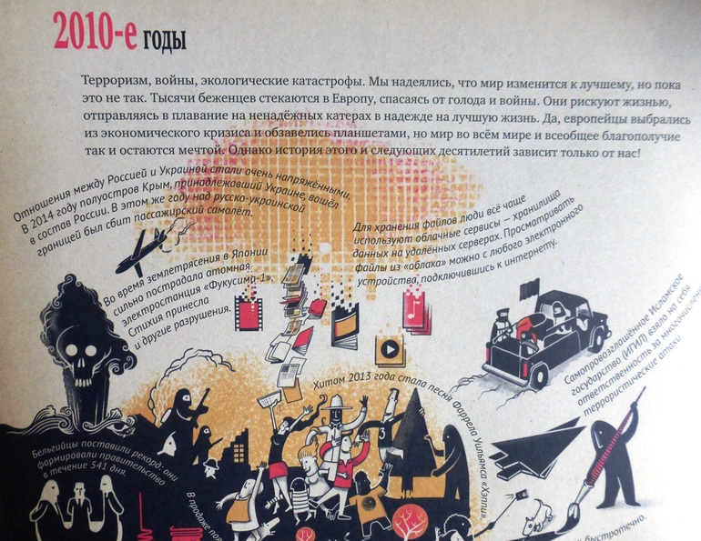 Затронуты эпоха за эпохой: зарождение жизни на Земле, эра динозавров, Древний Египет и Древняя Греция, кельты, гунны, инки, ацтеки, викинги, Средневековье и Возрождение... - и так до наших дней. Последняя дата в книге - это январь 2015 г