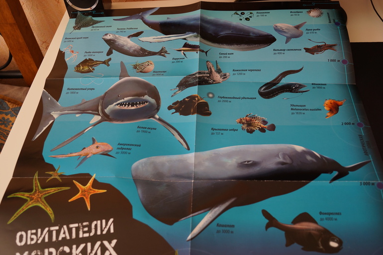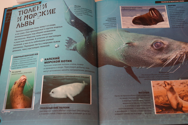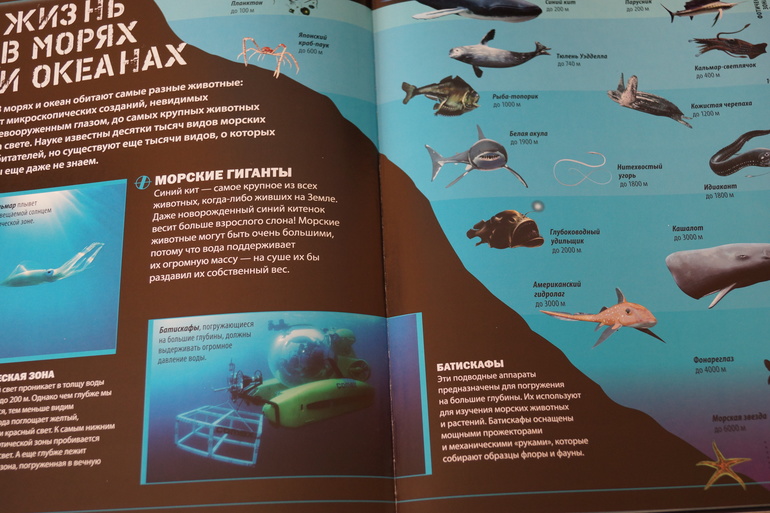 "Обитатели морских глубин" - взяла из-за любви сына к подводным обитателям. Мурены, скаты, морские ежи и прочие гады морские в последнее время пользуются у сына большим спросом. Обложка интегральная, листы мелованные, очень плотные. Есть дополнительный плакат. Книга понравилась, но брала я ее в майшопе, когда ее цена была 287 руб минус скидки. За нынешнюю цену не взяла бы.