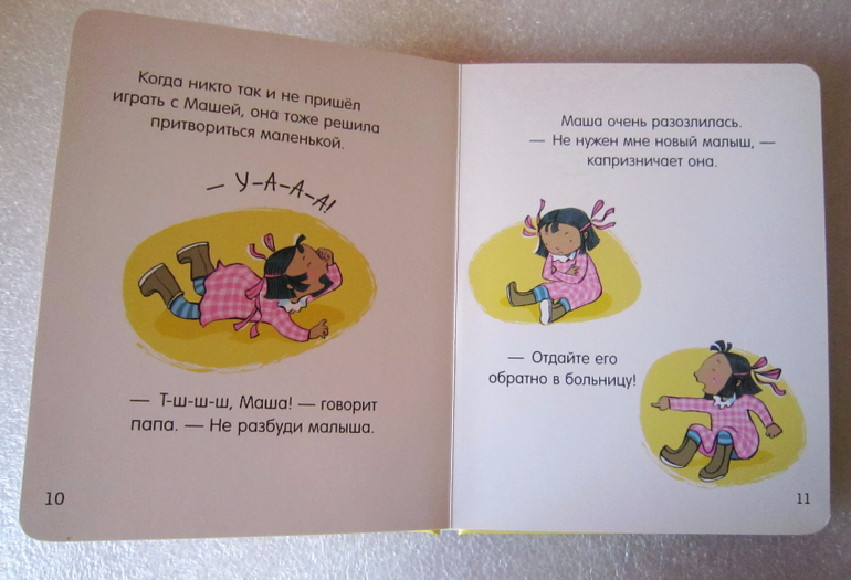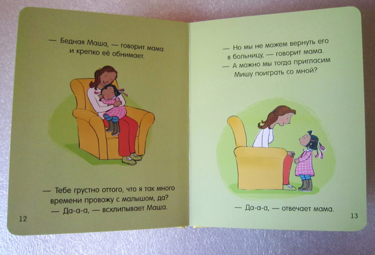 Хоть книгу мы начали читать за пару месяцев до появления братика, обыгрывали разные ситуации, описывали\рассказывали и вроде дочка всё понимала и соглашалась в свои 2,5 годика, но, когда перед ней оказался живой, плачущий комочек, когда у мамы действительно стало меньше времени для нее, вот тогда, как у Маши из книжки, началась ревность и проверка "а моя мама еще моя? а мне можно всё, что и ему?": агукала, одевала на ночь перчатки (как царапки у братика), подгузник, звала постоянно к себе....