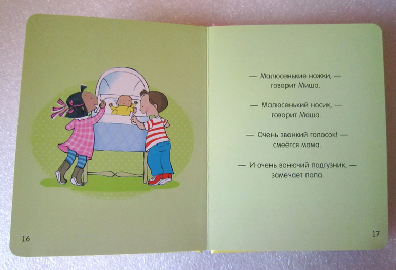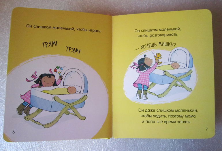 А теперь, когда сынок начал ходить и играть с дочкой, она стала по-другому воспринимать героев книги: это уже там она и братик (большой мальчик), а малыш - это будущий малыш (третий) в нашей семье :)