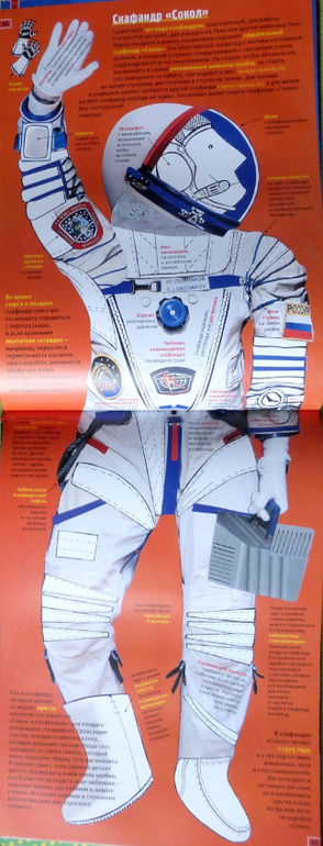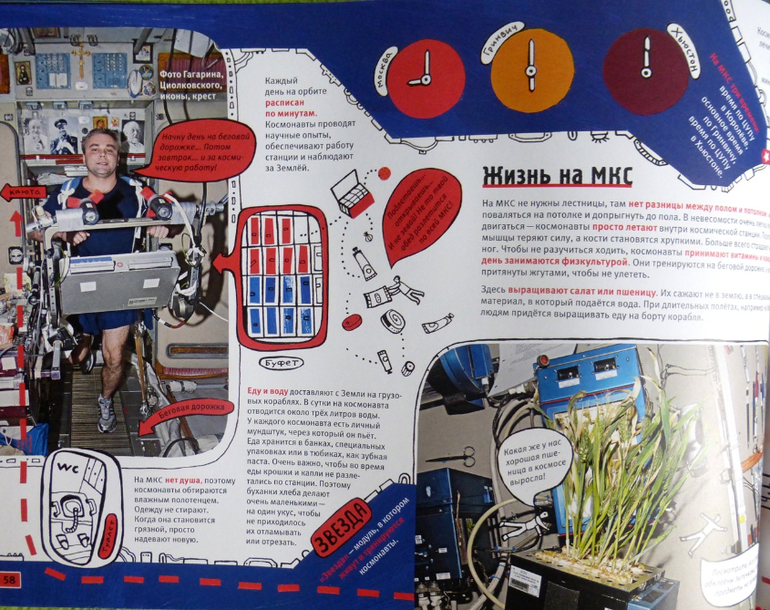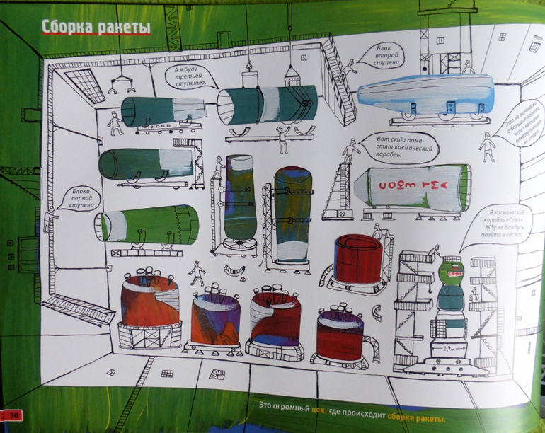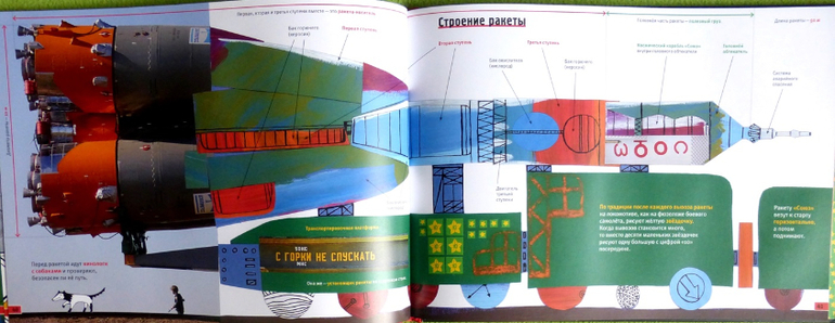 В книге чередуются вертикальные и горизонтальные развороты. Это даёт больше свободы, позволяет лучше передать динамику старта или показать строение ракеты. Благодаря такому расположению рисунков можно рассмотреть материал в мельчайших подробностях, например, скафандр, а взлет ракеты смотрится более зрелищно и действительно впечатляет.