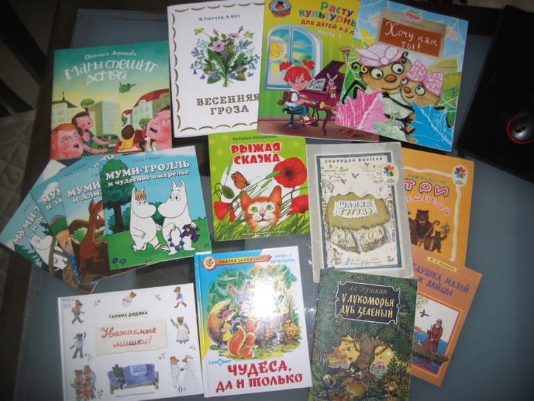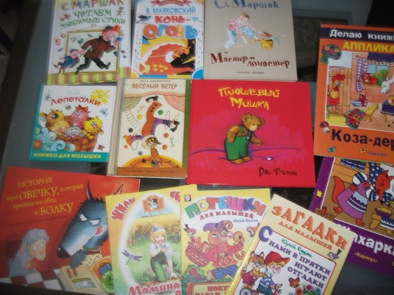 На этом фото постаралась собрать малышковые книжки, вытащенные из коробок. Книги- аппликации, все никак не доклеим. Но задумка у "Карапуза" хорошая, когда доклеим как раз самостоятельно читать будем, там шрифт огромный, текст правильный)