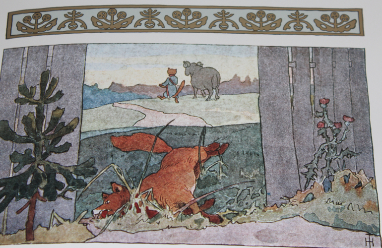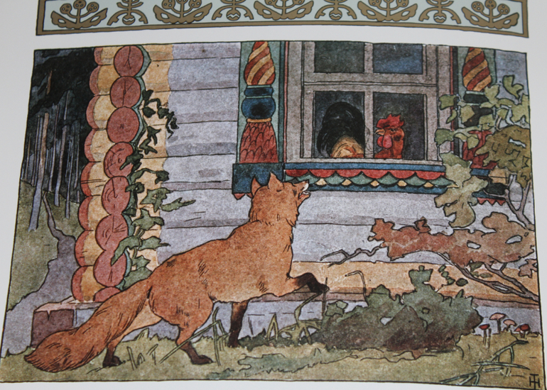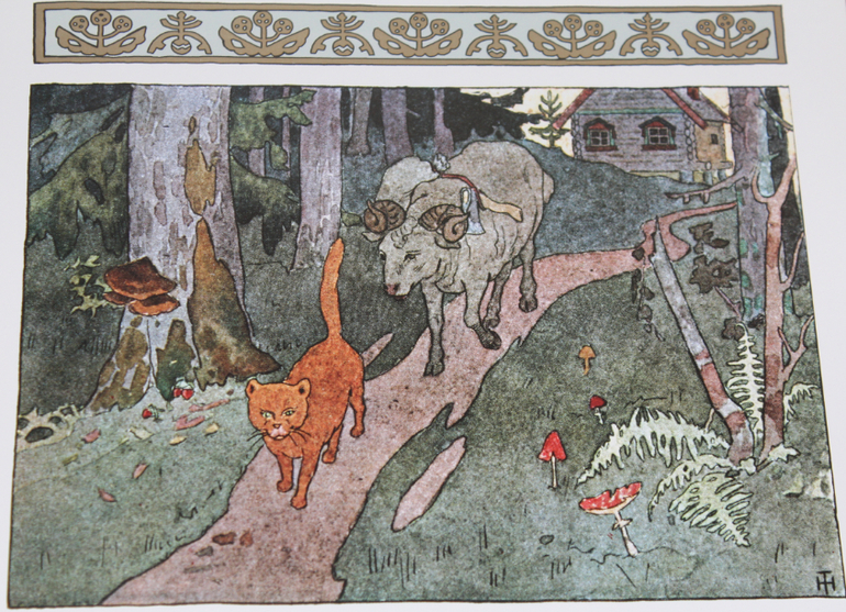 Вторая сказка "Петух, кот и баран".Сюжет все знают, я думаю. Пока кот с бараном в лесу ягоды собирали, лиса пыталась петуха выманить из дома и утащить к себе. Однажды её замысел удался, но за это ей отрубили голову.