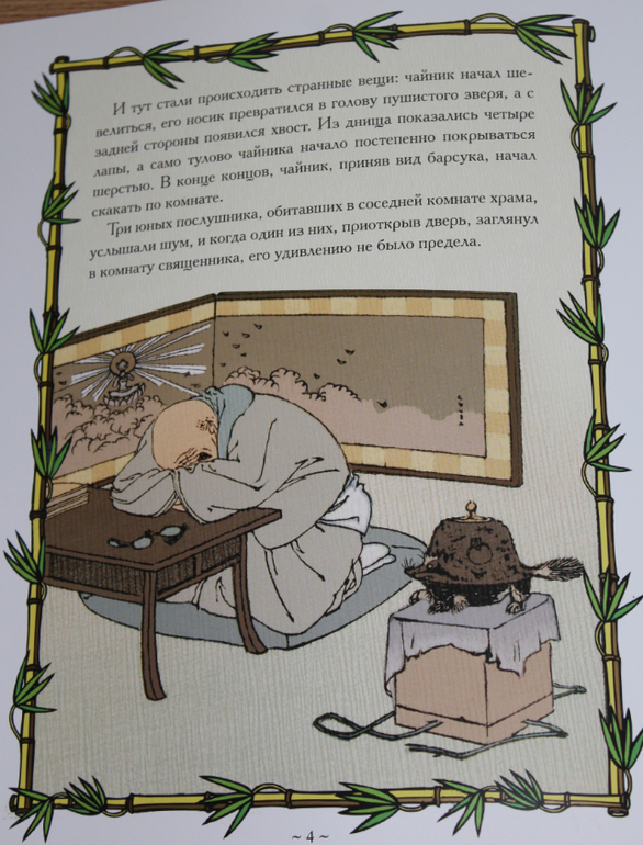 Японская сказка о том, как один монах купил себе чайник, а тот греть воду отказывался, так как ему было горячо. Ему больше нравилось в барсука превращаться. Продал монах чайник жестянщику, а тот быстренько сообразил как на этом разбогатеть можно. Стал с чудо-чайником представления устраивать. Нажил капитал и вернул чайник монаху, заплатив за то, что бы его окружили заботой и хорошо кормили. Ведь чайник и саке пить любил и трубку курить)))