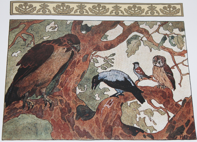 В книге две сказки. Первая "Орёл и ворона". Коротенькая сказочка про то, что ворона всех обижала, на неё пожаловались орлу. Орёл стал её судить, а она отпиралась, но он всё равно посадил её в острог. Конец.