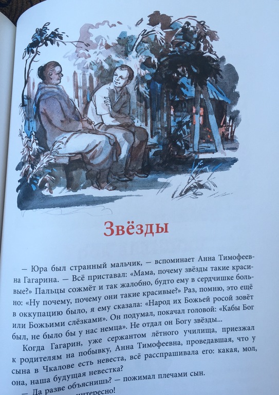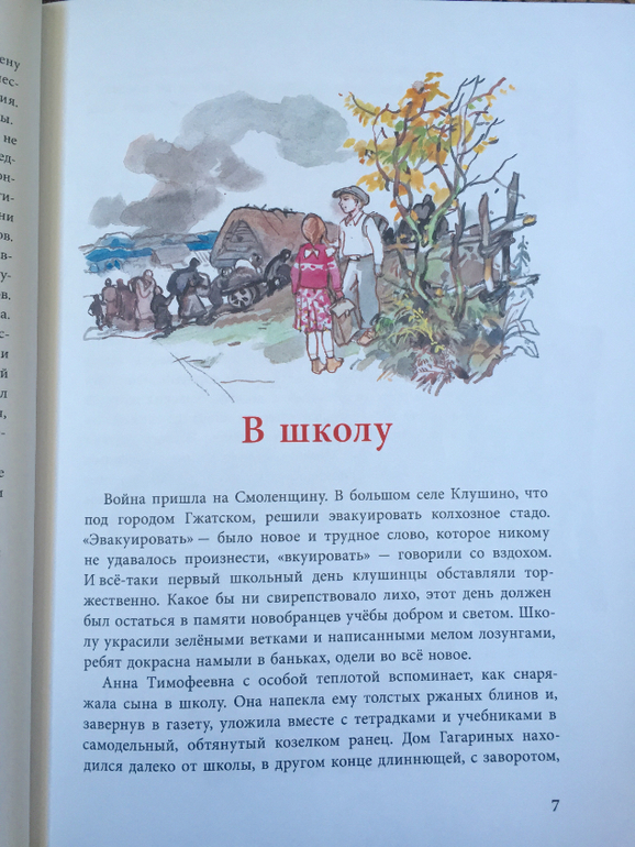 Школьные годы Гагарина пришлись на годы Великой Отечественной войны. В книге рассказывается про это время. И про мирное послевоенное, про подготовку к полету. Возрастная категория указана 12+. Но с 5-6 лет уже можно читать ребенку. Последние главы (про гибель героя) пока пропустим. Хотя там тоже все очень аккуратно, для детей рассказывается.