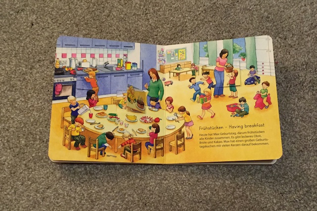 Nursery school - иллюстрированный словарь для малышей с окошками про детский сад. Сопровождающий текст на немецком. Читали с папой, но Настя не заинтересовалась. Наверное, потому что на немецком)))