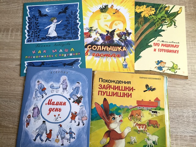 Тонкие книжки. Здесь все давно знакомое и любимое. "Похождения Зайчишки-Пушишки" еще из моего детства. Настя ее тоже полюбила горячо и надолго. Я все время оставляла эту книжечку в России (так как нет моих сил читать этот текст в стотысячный раз!), но дочка сама позвонила бабушке в Скайпе и попросила привезти "Пушишку".