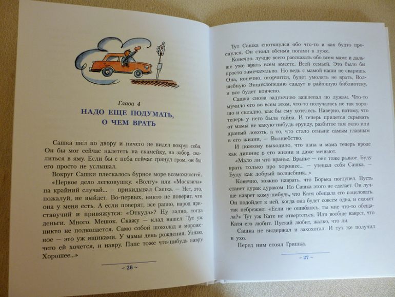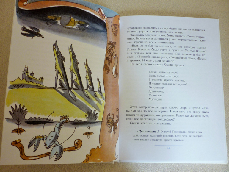 До этой книги творчество Софьи Прокофьевой оставляло нас равнодушными. В прошлом году приобрели несколько необыкновенно красивых книг издательства «Нигма». Но дальше второй главы чтение не пошло. Ребёнок книги убрал подальше на полку и больше не возвращался. А эту книгу прочёл за выходные запоем. История очень необычная. Пятиклассник Саша забирается на чердак старого дома, чтобы в тишине и без свидетелей стереть из дневника двойку по математике. Но стер он её так тщательно, что на месте двойки теперь в дневнике зияет дырка. Саша в отчаянье, из-за двойки рушатся его планы на день рождения. Но тут он проваливается в старый сундук, заполненный старинными книгами. Среди книг мальчик нашёл волшебную энциклопедию, а в ней заклинание превращающее любое вранье в правду. Нужно только, чтобы кто-нибудь в эту ложь поверил. Сашка быстренько испробовал на доверчивой первоклашке Лёльке. Сначала ему показалось, что ничего не произошло, и он даже расстроился, но вскоре убедился, что заклинание работает. Казалось, что теперь жизнь двоечника должна наладиться, но не тут- то было. Одно враньё тянет за собой другое. Даже слова, сказанные Сашкой сгоряча, без какой-либо корысти влекут неприятности для его мамы и папы. А затем и для всего города. Сашка так запутался, что мечтает об одном, чтобы волшебство прекратилось. Вот он уже бежит по опустевшему городу к старому дому, его стараниями город остался без воды и электричества, трамваи и троллейбусы не ходят. По пути врёт что в доме пожар и что он живёт в этом доме. И опять волшебство сработало, теперь он живёт в том самом старом, объятом пламенем доме, на чердаке которого лежит волшебная энциклопедия. И Сашке во чтобы-то не стало нужно до неё добраться….