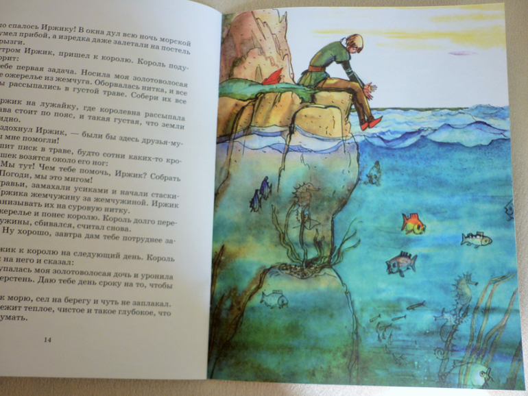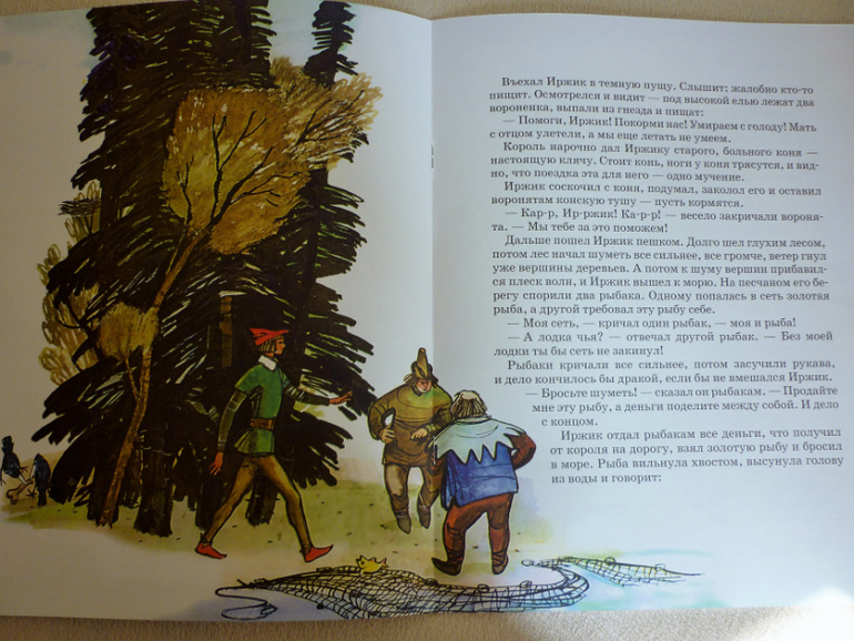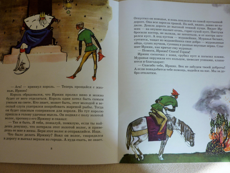 Ну, эта сказка любимая с детства. Если кто не помнит, вкратце расскажу о чём сказка. Поварёнок Иржик готовит для короля волшебную рыбу. Ему строго-настрого запретили её пробовать, так как всякий кто отведает хоть кусочек станет понимать язык зверей и птиц. Но Иржик, чтобы убедиться, что рыба готова съел маленький кусок. Король и Иржик услышали разговор двух воробьёв о необыкновенной красавице из другого королевства. Злой и коварный король, как водится, отправил за Златовлаской Иржика. Иржик по дороге выручает из беды птенцов, муравьёв и муху, которые в дальнейшем отплатят добром за добро. Он выполняет невыполнимые задания отца Златовласки, а затем доставляет красавицу к королю. Но король вместо благодарности убивает Иржика. Златовласка оживляет Иржика с помощью мёртвой и живой. Король погибает. А Иржик с Златовлаской живут долго и счастливо.