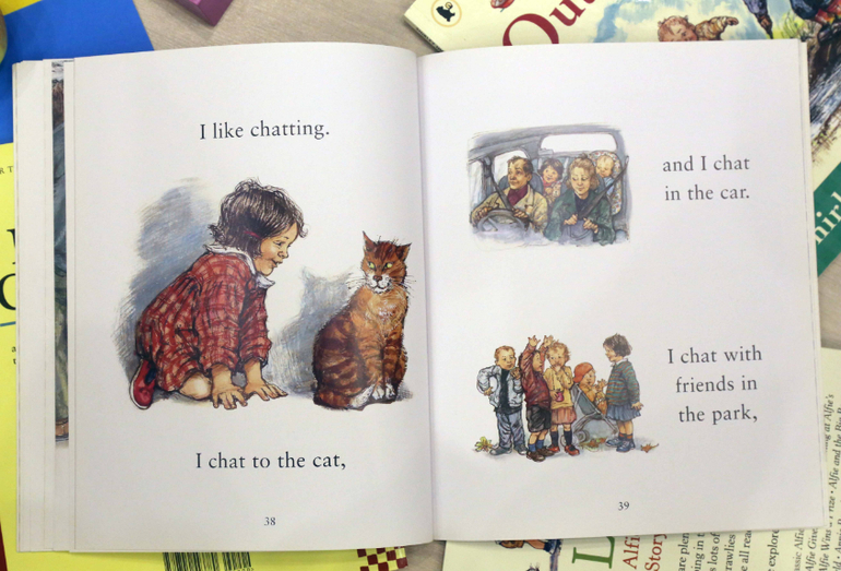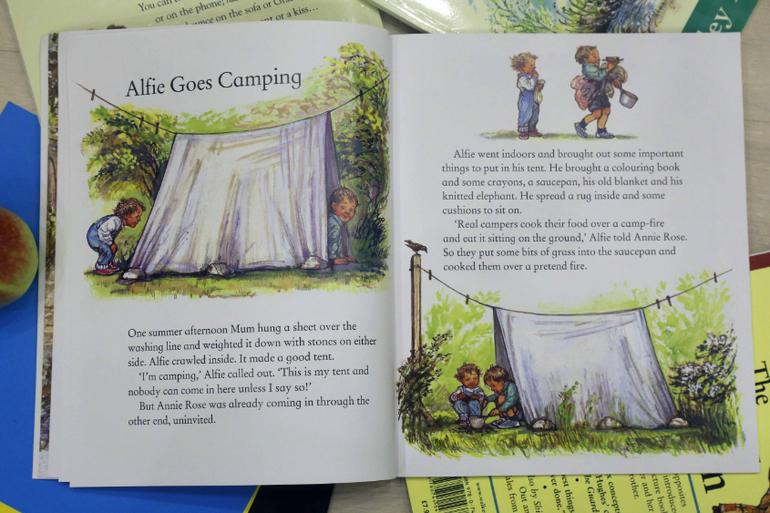 Следующая книга The Big Alfie Out of Doors Storybook. Это книга уже для детей постарше. В ней несколько длинных рассказов и коротенькие, на одну страничку, поэмы. Рассказы про поездку на море, ночевку в палатке. Про игру в "магазин", когда твой товар - это травинки, каштаны и листочки. Про овечку, которая потерялась и никак не могла вернуться на свое пастбище. С Ваней начали читать эту книгу в 2,6. Вначале читали только один рассказ, про поездку на море. А потом он начал слушать и остальные рассказы.