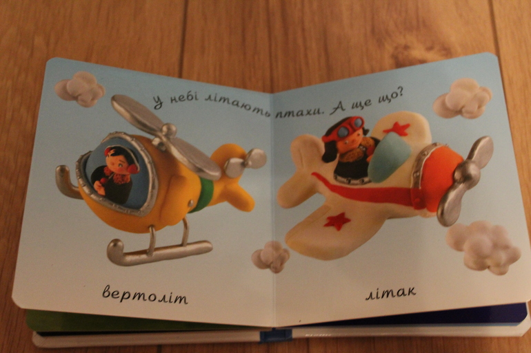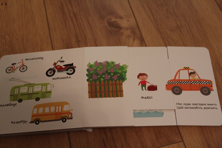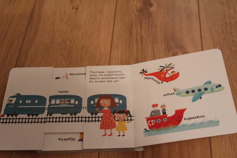 В продолжение транспортной темы (а у нас она все продолжается и продолжается) есть еще любимица украинского издательства "Школа" "Їду, плаваю, лечу". Это книга с подвижными элементами, на каждом развороте по одному такому. К некоторым транспортным средствам стихи-загадки предложены, основная часть просто подписана. Формат маленький, рисунки симпатичные, качество печати и элементов подвижных хорошее - пока все целы. С одной стороны приятно, что это свой хороший продукт - сами нарисовали и придумали, с другой - цена высоковата. Остальные книги из серии (всего в серии 4) раздарили, поскольку мы все больше интересуемся книжками-не игрушками).