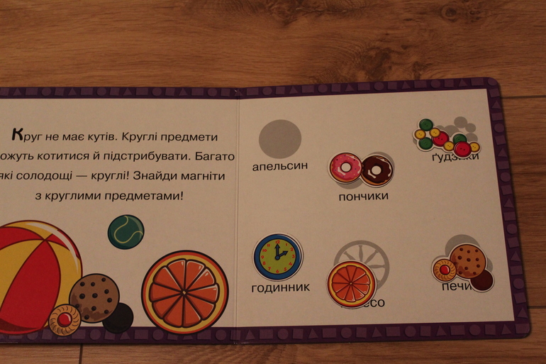 Еще в нашей библиотеке есть книга с магнитами "Вивчаємо форми" ("Изучаем формы"). Здесь всего 4 разворота - по 1 на круг, квадрат, треугольник и прямоугольник и необходимо разместить магниты на соответствующие места по принципу лото - магнитное теневое лото получается, если быть точнее. Книга мне досталась по очень низкой цене, дешевле лото. Сын, как любитель книг, лото и магнитов частенько приносит эту книжечку.