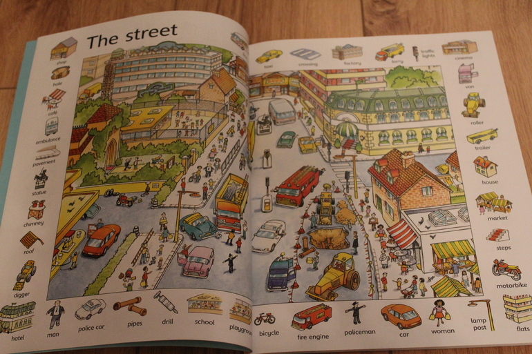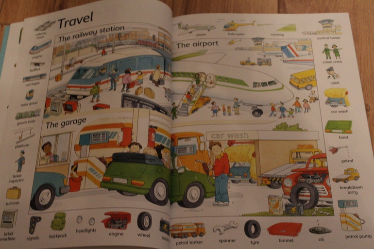 Из иностранных книг еще пару разворотов (конечно же транспортных) Артема интересует в "First Thousand Words in English" , но вообще у книги, мне кажется, большой потенциал, как для развития речи, так и в дальнейшем для изучения английского. Иллюстрации очень милые, юмор добрый, много разных тем, по краям выделены предметы для поиска на развороте, также на каждом развороте спрятался утенок, которого пока ищет только мама.