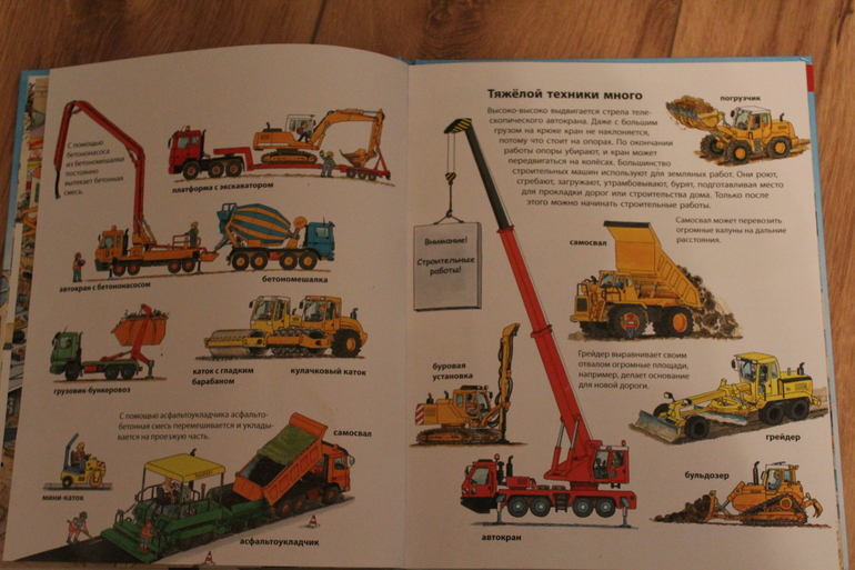 Покажу только содержание и несколько любимых разворотов "Техники". После этой книги мы пока не признаем ни "Книжку про машинки", ни "Путешествие на машине" от "Улыбки". Артем несет ее папе после работы, иногда, если успеет, то и до, маме тоже носит и я безмерно рада, что машины подписаны и некоторые их составляющие тоже, и что теперь я могу отличить экскаватор от колесного погрузчика :) Текст пока не читаем, разве что проглядываю в поисках ответа на настойчивый "указательный" вопрос. Обычно ищем разные транспортные средства, придумываем истории, о том, куда и зачем едут разные машины.