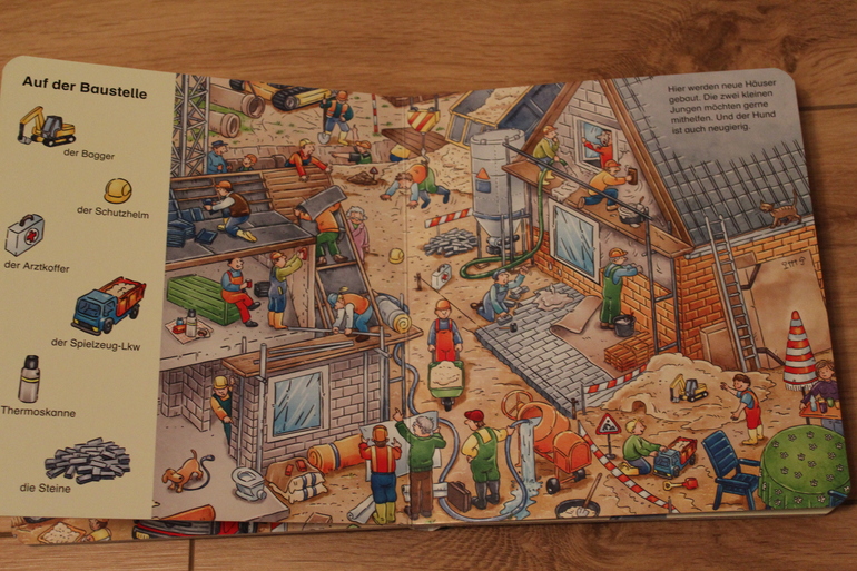 Покажу сразу еще один немецкий виммельбух "Findest du die Sachen", который также достался нам в подарок. Он тоже картонный, формат поменьше предыдущих, тематика мальчишеская - по несколько разворотов на пиратов, стройку и рыцарскую тему, сбоку вынесены предметы, которые необходимо найти на развороте. Артем периодически рассматривает и здесь любимую тему - стройку, мне не очень нравятся выражения изображенных лиц и юмор, но для разнообразия наверное книги разные нужны.