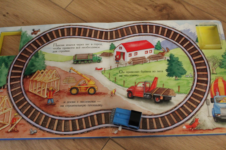 В книге небольшая простая история о трудолюбивом паровозике Пыхтике, который мечтал привезти в свой город цирк. Для этого он много-много работал и конечно же достиг своего. Главная фишка книги - это магнитная лента железной дороги на каждом развороте, по которой может ездить заводной паровозик, что конечно же приводит в восторг моего маленького читателя. Историю иногда слушаем, порой отказываемся, но поиграть паровозиком всегда рады. Впрочем картинки интересно и порассматривать.