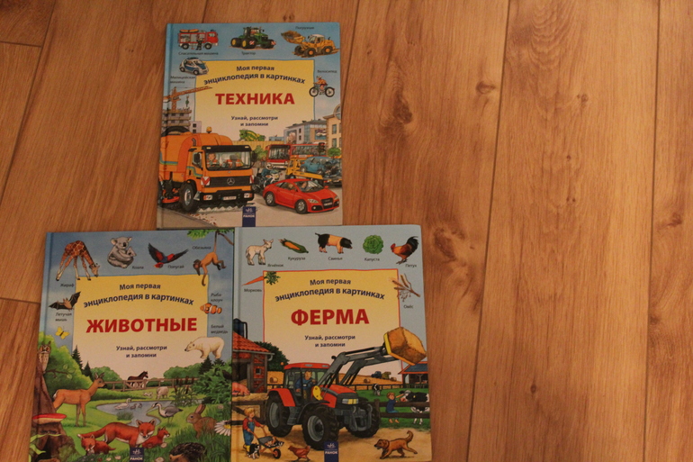 Остальные книжки-игрушки либо переросли, либо достаем очень редко.С энциклопедий, виммельбухов и прочего в первую очередь выделю бесспорных лидеров по количеству просмотров - серию энциклопедий издательства "Ранок" "Моя первая энциклопедия в картинках", и особенно любимую "Технику". Книги как по мне очень удачные, даже наш папа о них высокого мнения и просил прикупить второй экземпляр "Техники" на потом, поскольку теперешний уже не в самом хорошем состоянии. К сожалению, их больше не выпускают и найти в продаже мне уже не удалось. На фото только 3 из 4, поскольку 4ю почему-то пока достаем редко, зато живее будет :)