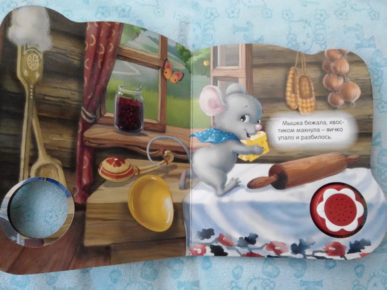 "Курочка Ряба" ("Азбукварик", 2015) Насте впервые увидела ее в гостях и не отходила от книги все время, пока мы там были. Увидев такую в большом детском магазине, я не смогла пройти мимо. Песенка дома крутилась постоянно, батарейка уже села. Иллюстрации Юлии Гапоненко.