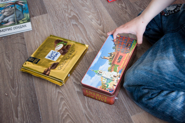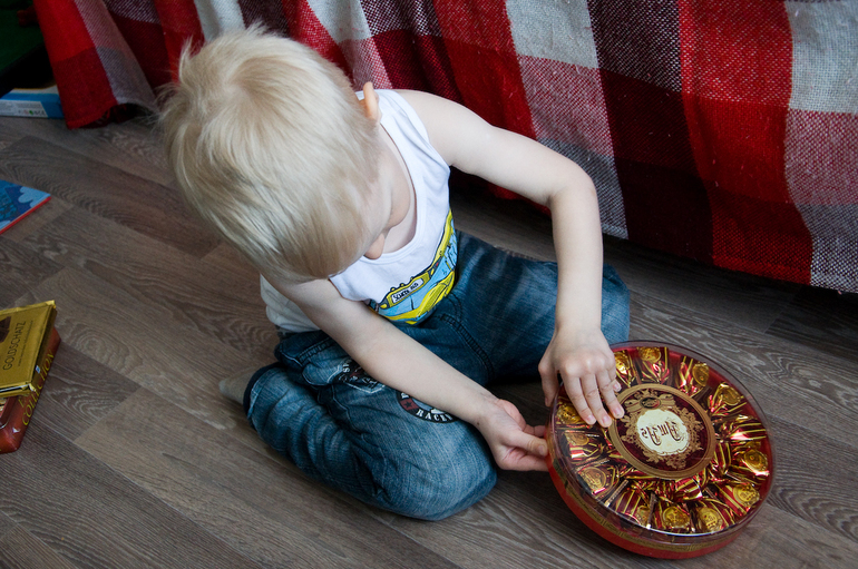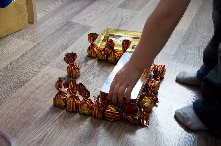 Семка пришел от бабушки и тут же начал расставлять конфеты, строить из них дороги, города и замки.