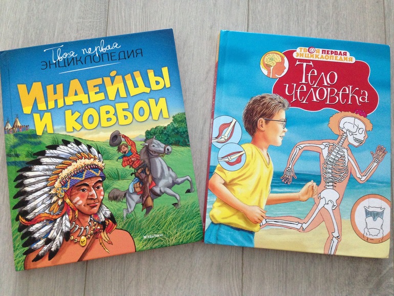 Энциклопедии от Махаон. "Тело человека" зачитано "до дыр", чуть ли не каждый месяц читаем. В этом месяце присоединились и Индейцы)