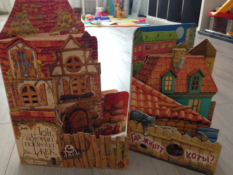Книжки-картонки. "Дом, который построил Джек" и "Где живут коты?". Последнюю покупала младшему сыну, но старший тоже с удовольствием слушает) а Джек... Даже не знаю, что про него сказать... Книга красивая, но ни меня, ни детей не зацепила. Первый раз ее читали, они даже не дослушали и не досмотрели. Такое очень редко встречается. Потом читали пару раз, я предлагала, но интереса не вызвала. Хотя книга, очень качественная, красивая, этакий виммельбух)