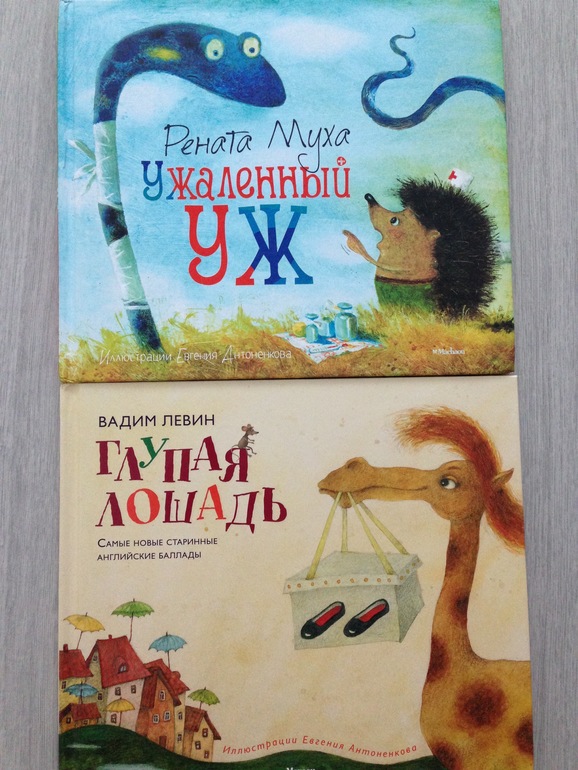 Две книжечки от изд.Махаон - "Ужаленный Уж" Ренаты Мухи и "Глупая лошадь" Вадима Левина. "Ужаленный Уж" - любимая книга младшего сына, но Арсю тоже всегда приходит послушать, когда читаем. И последнее время он проникся ( до этого любви не замечала) к Глупой лошади. Читали много раз. А последнее стихотворение, про бычка, попросил выучить с ним наизусть - такое у нас впервые))))