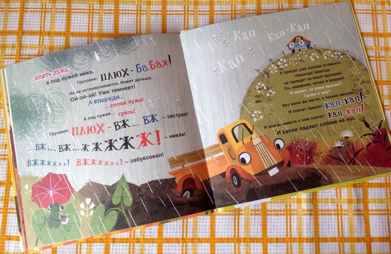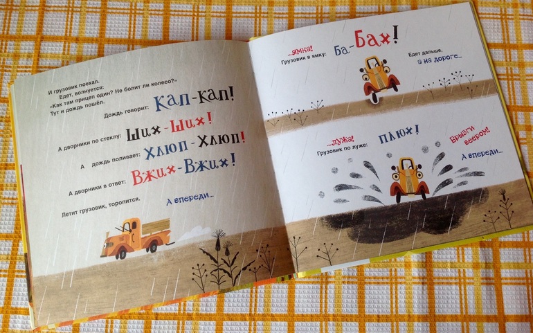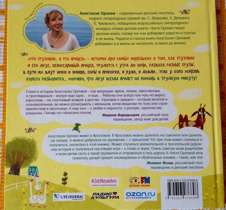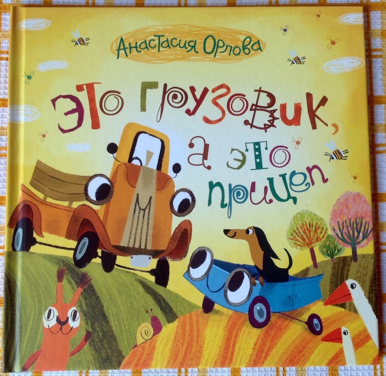 "Это грузовик, а это прицеп" Книгу ребенку ещё не давала, но уверена что он её очень оценит. Покажу немного фото. Мне не нравится задняя обложка ( наверное, как-то называется), а в целом позитивная, желтенькая:)